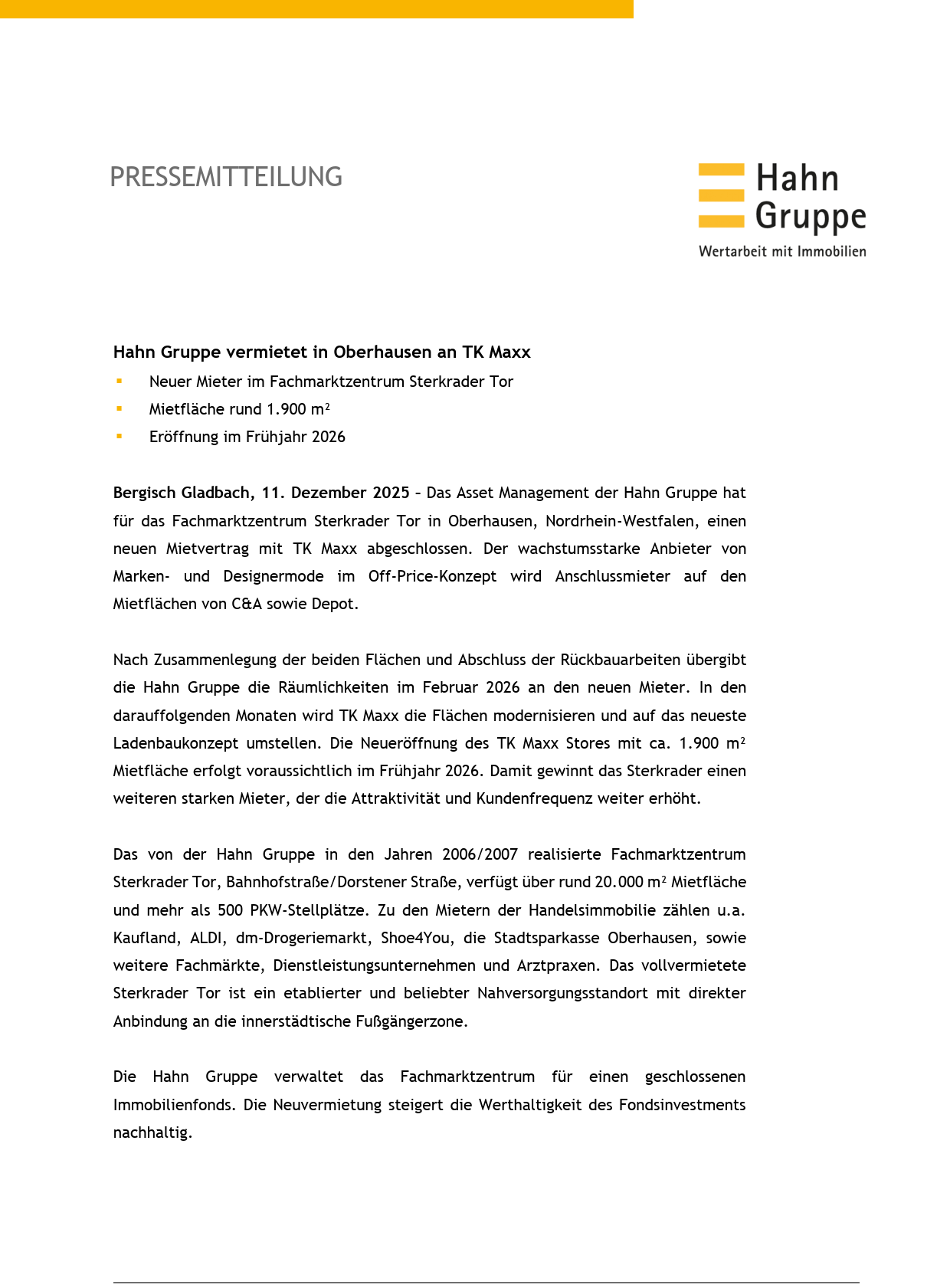 Die Tochtergesellschaft Retail Management Expertise Asset & Property Management GmbH mit Sitz in Oberhausen erbringt im Wesentlichen vom Investmentfondsgeschäft der Hahn Gruppe unabhängige Center-Management- und Property-Management-Dienstleistungen für Dritte.